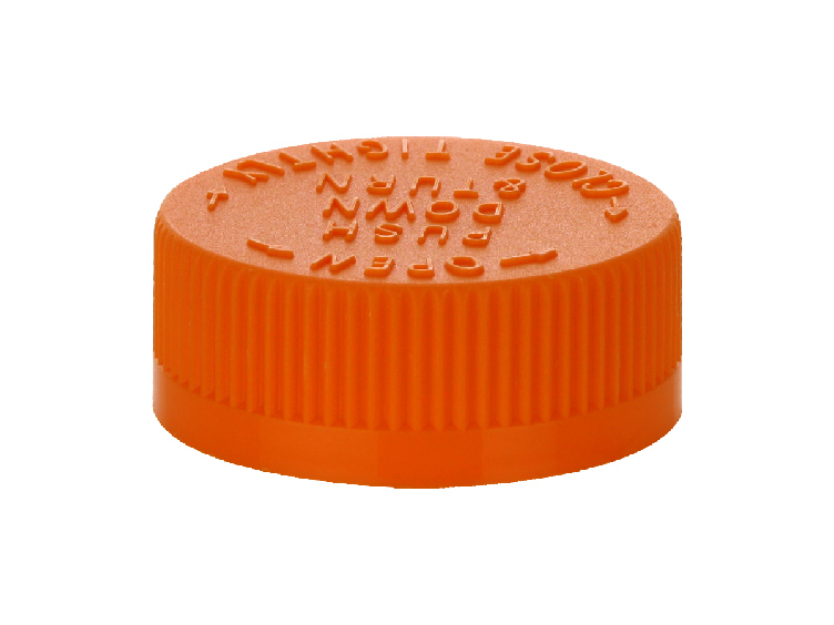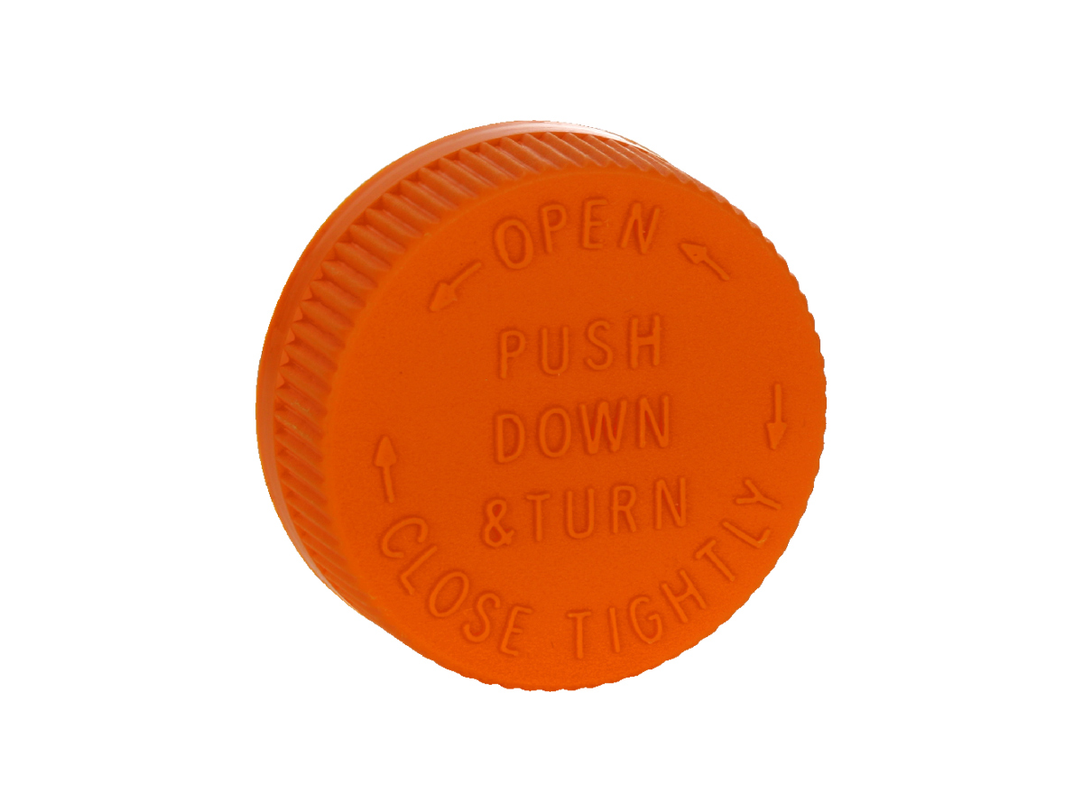 Orange 33-400 CRC (child resistant cap) non dispensing continuous thread (screw on) ribbed finish PP plastic bottle cap with heat seal liner & opening instructions for small bottles. Bottle closure is 1 3/8 in. wide x 11/16 in. high.