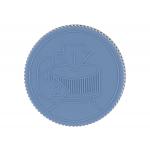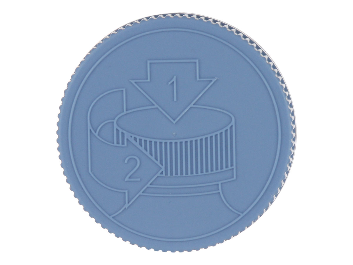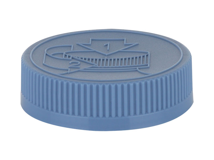 53-400 blue CRC (child resistant) flat ribbed PP plastic non dispensing jar cap with HS035 HS liner & pictorial opening instructions on top. Outside jar closure is 2 3/8 in. wide x 5/8 in. high. Packed 750 to case.