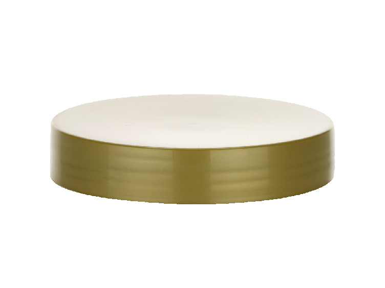 58-400 Gold flat smooth PP plastic continuous thread jar cap with F-217 liner. Jar closure is 2 1/4 in. wide x 1/2 in. high. Packed 1100 to case.