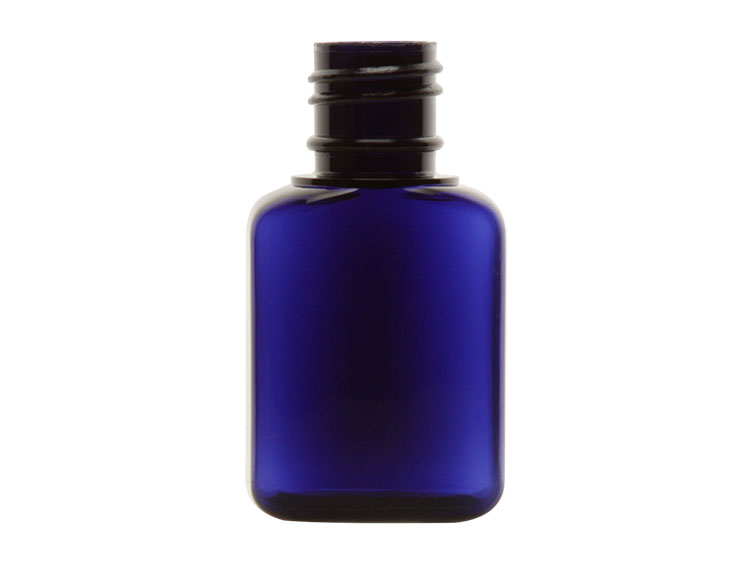 1 oz. dark blue oblong semi-translucent small other plastic bottle. Bottles are 2 3/4 in. high x 1 1/2 in. wide x 1 in. deep. Treatment pump is included.