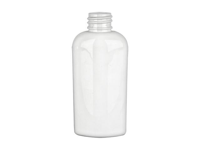 2 oz. white opaque PET Cosmo tapered oval 20-410 plastic small bottle with a gloss finish. Bottle is 3 3/4 in. high including neck 1 3/4 in wide at top x 1 1/2 in wide at bottom 15/16 in deep.