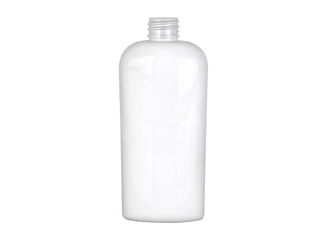 4 oz. White cosmo reverse tapered oval PET opaque 20-410 plastic bottle. Bottle is 4 7/8 in. high including neck x 2 1/8 wide at bottom x 2 1/4 in wide at top x 1 1/4 in. deep. Packed 390 to case.