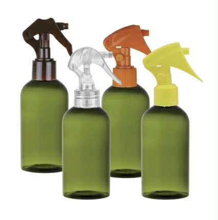 5 oz. Green autumn 24-410 Boston round plastic translucent PET (Polyethylene Terrphthalate) bottle with yellow mini trigger sprayer. Packed 344 to a case.