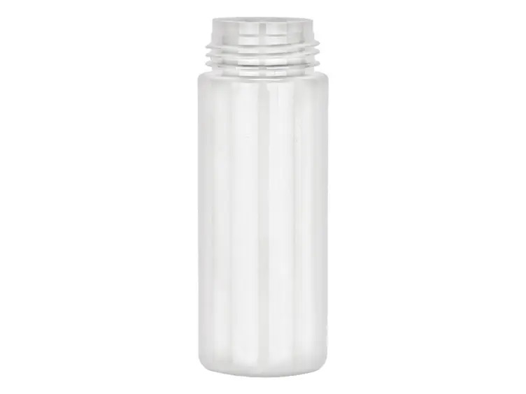 6 oz. (180 ml) Clear 43 MM cylinder round plastic bottle. Bottle is 5 1/4 in high including neck x 1 7/8 in. wide. Foamer pump is included.