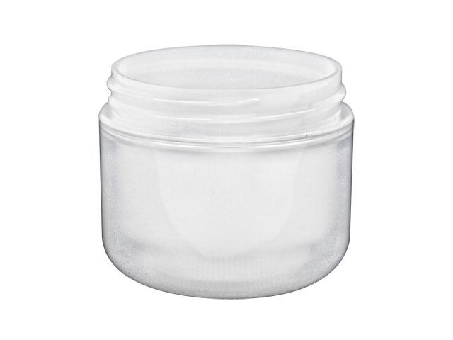 2 oz. Natural 58-400 plastic double wall, round base PP plastic jar. Plastic cosmetic jar is 1 15/16 in high including neck x 2 1/4 in wide. Caps are sold separately below. Jar is also sold in an 4 & 8 oz.