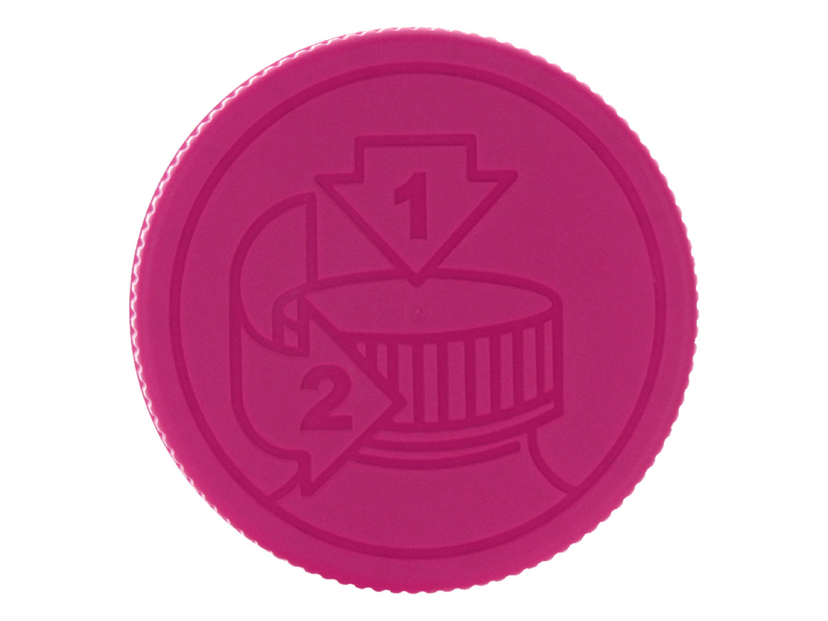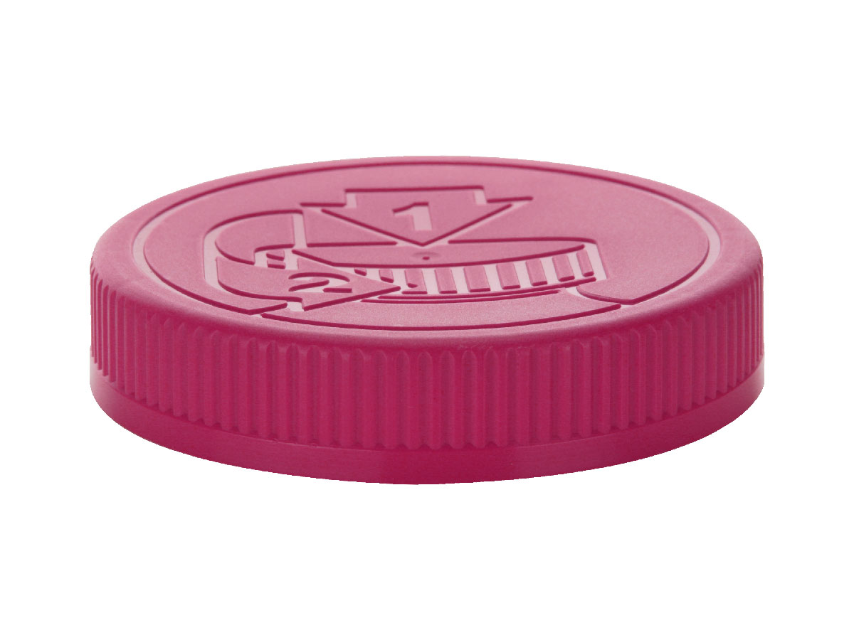 70-400 pink CRC (child resistant) flat ribbed PP plastic non dispensing jar cap with dual liner, a (lift and peel) blue heat seal liner and a foam liner. Pictorial opening instructions on top. Outside jar closure is 3 in. wide x 5/8 in. high. Packed 400 to case.