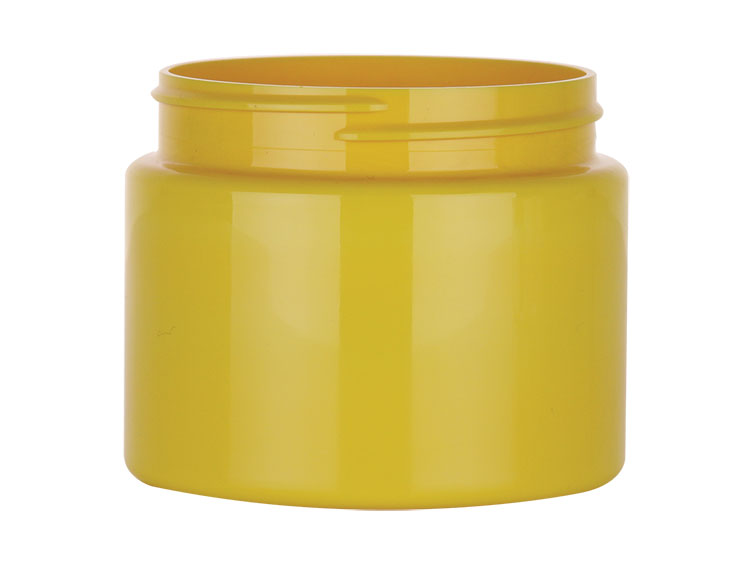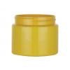 8 oz. Yellow 70-400 round plastic single wall straight sided opaque PET square base jar. Plastic cosmetic jar is 2 7/16 in high including neck x 3 in wide. Colored lid is included.